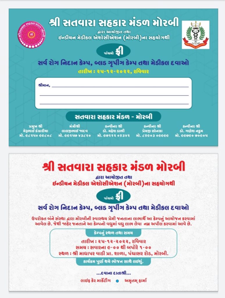 મોરબી પંથકમાં સતત અનેકવિધ સેવાકીય પ્રવૃત્તિઓ થતી રહે છે જરૂરિયાતમંદ લોકો આવી પ્રવૃત્તિઓથી લાભાન્વીત થતા હોય છે,હાલના સમયમાં લોકોનું આરોગ્ય વિષયક સેવાઓની અતિ આવશ્યક છે ત્યારે સતવારા સહકાર મંડળ-મોરબીએ ઈન્ડિયન મેડિકલ એસોસિએશન (મોરબી)ના સહયોગથી *સર્વ રોગ નિદાન બ્લડ ગૃપિંગ તથા મેડિકલ દવા માટેનું કેમ્પનું અદકેરું આયોજન તા.25.12.22 ને રવિવારે સવારે 9.00 વાગ્યાથી બપોરના 1.00 વાગ્યા સુધી અત્રેની માધાપરવાડી શાળા ખાતે કરવામાં આવેલ છે,જેમાં મગજની બીમારી,હૃદયરોગ, જનરલ મેડિસિન,બાળરોગ, હાડકાની તકલીફો,ચામડીના રોગો સ્ત્રીરોગ,આંખની તકલીફ,ડેન્ટલ વગેરે રોગોના દર્દીઓની નિષ્ણાંત ડોકટરો દ્વારા તપાસ કરવામાં આવશે અને નિઃશુલ્ક દવાઓ પણ આપવામાં આવશે તો ખુબજ મોટી સંખ્યામાં દર્દીઓને આ મેડીકલ કેમ્પનો લાભ લેવા સતવારા સહકાર મંડળ- મોરબીના કાર્યકર્તાઓએ જણાવ્યું છે,