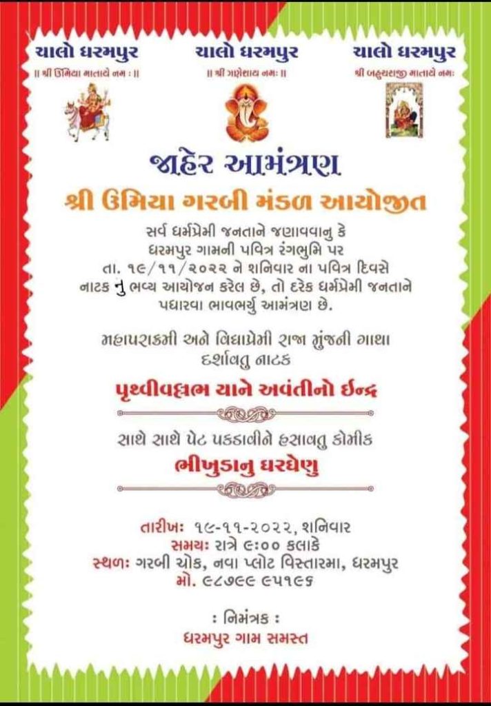 ઉમિયા ગરબી મંડળ દ્વારા ધરમપુર ગામે નવા પ્લોટ વિસ્તારમાં આવેલા ગરબી ચોક ખાતે આજે તારીખ ૧૯ નવેમ્બર ને શનિવારના રોજ રાત્રે ૯ કલાકે મહાપરાક્રમી અને વિદ્યપ્રેમી રાજા મુંજની ગાથા દર્શાવતું પૃથ્વીવલ્લભ યાને અવંતીનો ઈન્દ્ર નાટક અને પેટ પકડીને હસાવતુ ભીખુડાનું ઘરઘેણું કોમિક નાટક ભજવવામાં આવશે. તો આ નાટક અને કોમિક નિહાળવા ધર્મપ્રેમી જનતાને જાહેર આમંત્રણ પાઠવવામાં આવેલ છે.