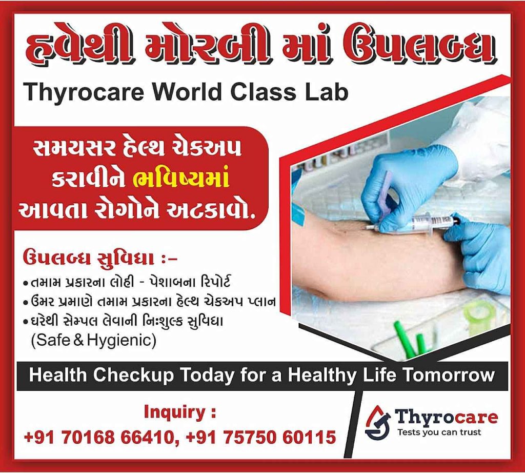 મોરબીમાં થાયરોકેર સર્વિસ ઉપલબ્ધ થયેલ છે જેમાં લોકોને ક્યાંય પણ જવાની જરૂર નથી. થાયરોકેર લેબનો સ્ટાફ આપના ઘરે આવીને કોઈ પણ અલગ ચાર્જ વગર સેમ્પલ કલેક્શન કરી જશે. વર્લ્ડ કલાસ થાયરોકેર લેબ મારફત 100 ટકા સેફ અને હાઈજેનિક રીપોર્ટ કરી શકાશે તેમજ ફ્રી હોમ કલેકશનની સુવિધા આપવામાં આવશે અને હા ! ફૂલ બોડી ચેક-અપ કે જે દરેક લોકોને પરવળે એવા ઓછા ચાર્જ સાથે અને રિપોર્ટમાં જરૂરિયાતવાળા પેશન્ટને કન્સલ્ટન્ટ સાથે અપોઈન્ટ પણ કરી આપવામાં આવશે. આ અંગે વધુ માહિતી માટે 7016866410 તેમજ 7575060115 નંબર પર સંપર્ક કરી શકાશે.