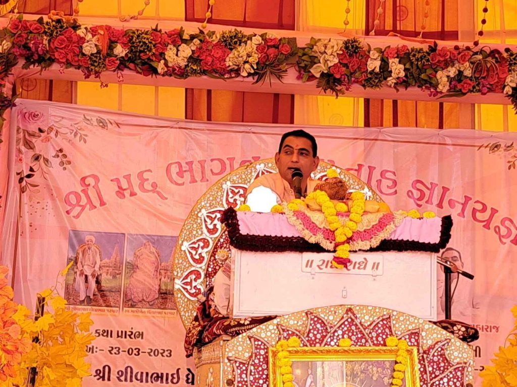 જેમાં શાસ્ત્રી કિશોર મહારાજ પોતાની સંગીતમય શૈલીમાં કથા શ્રવણ કરાવી રહ્યા છે, આ કથાના દાતા અને આયોજક શિવાભાઈ ઘેલાભાઈ પરમાર અને મનજીભાઈ ધનજીભાઈ પરમાર છે,દરરોજ હજારો ભાવિક ભક્તજનો કથા શ્રવણનો લાભ લઈ ધન્યતા અનુભવી રહ્યા છે. કથા દરમ્યાન કપિલ જન્મ,વામન અવતાર, કૃષ્ણ જન્મ, ગિરિરાજ અનકુટ, રૂક્ષમણી વિવાહ,સુદામા ચરિત્ર જેવા પાવન પ્રસંગો વાજતે ગાજતે પરંપરાગત શૈલીમાં ઉજવાઈ રહ્યા છે. દરરોજ રાત્રે સંતો દ્વારા સંતવાણી અને લોક સાહિત્યનું પણ અદકેરું આયોજન થયું છે.