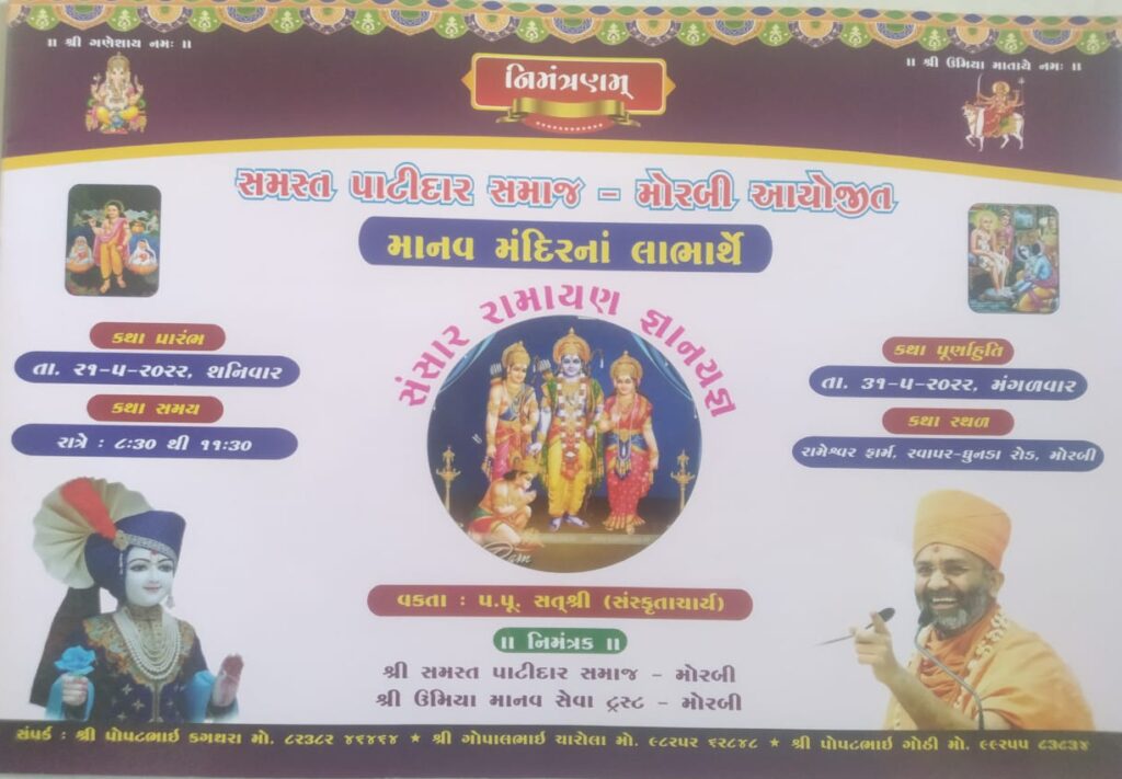 મોરબી ઉમિયા માનવ મંદિરના લાભાર્થે જ્ઞાન,દાન અને સન્માનની સરવાણી સમાન સંસાર રામાયણ કથાનું અદકેરું આયોજન