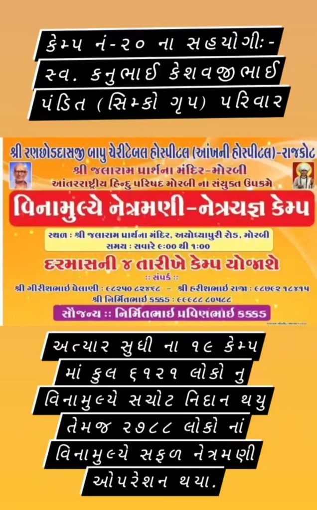 મોરબી: સમગ્ર ગુજરાતની નંબર ૧ આંખની હોસ્પીટલ રણછોડદાસજી બાપુ ચેરીટેબલ હોસ્પીટલ-રાજકોટ, જલારામ પ્રાર્થના મંદિર-મોરબી તથા આંતરરાષ્ટ્રીય હિન્દુ પરિષદ-મોરબી દ્વારા સર્વજ્ઞાતિય વિનામુલ્યે નેત્રમણી-નેત્રયજ્ઞ કેમ્પ દર મહીનાની ૪ તારીખે શહેરના જલારામ પ્રાર્થના મંદિર, અયોધ્યાપુરી રોડ, મોરબી ખાતે યોજાશે.