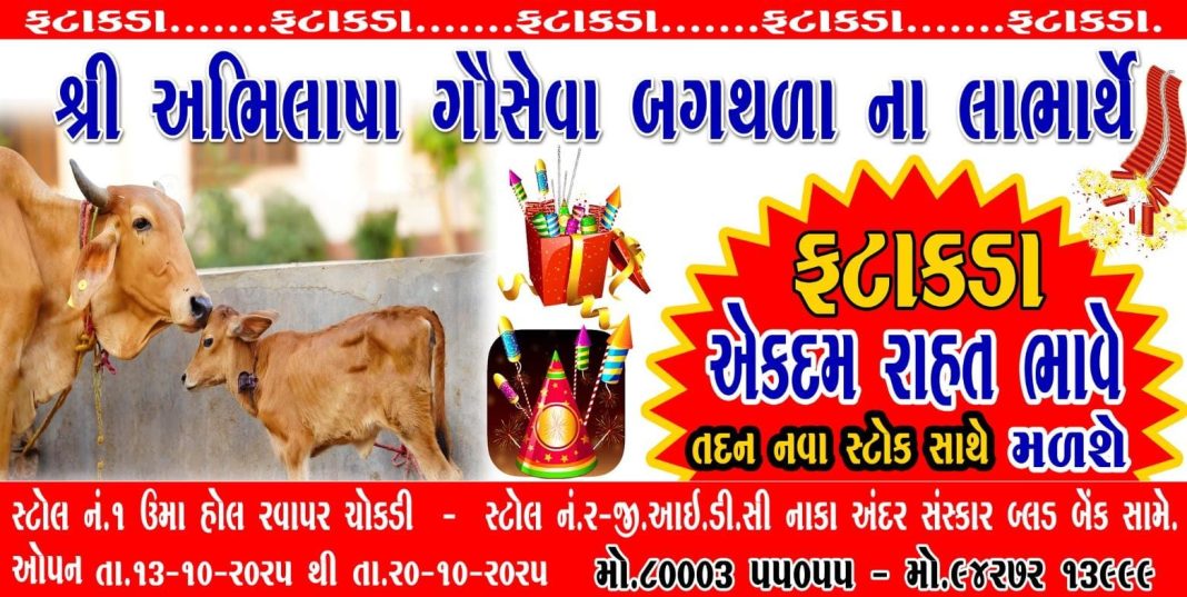 બગથળાની અભિલાષા ગૌશાળાના લાભાર્થે રાહતભાવે ફટાકડા સ્ટોલનુ આયોજન