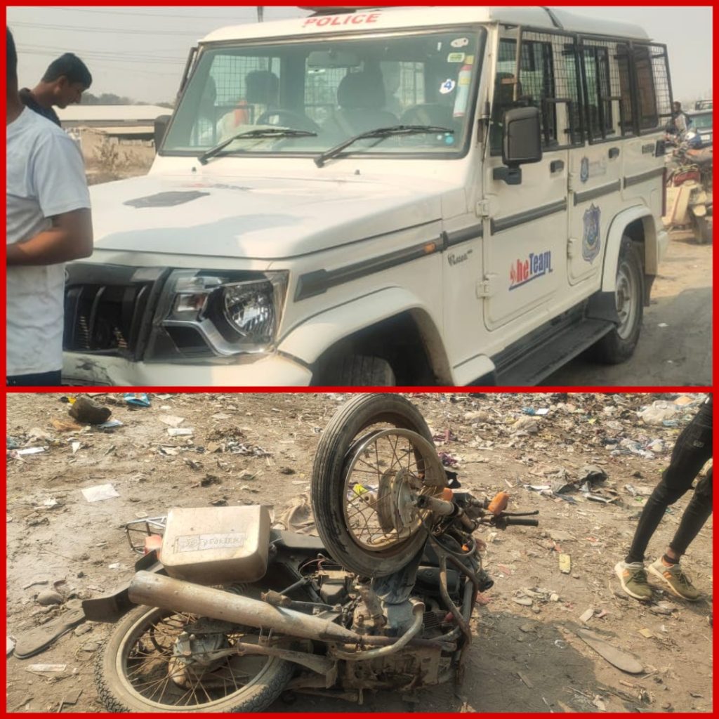 મોરબીના ઘૂટું રોડ પર આવેલ હરીઓમ પાર્ક નજીક પોલીસની ગાડી અને બાઈક વચ્ચે અકસ્માત સર્જ્યો હતો જેમાં બાઈક ચાલક ને ઈજા થતા સારવાર માટે ખસેડવામાં આવ્યો છે તો અકસ્માત થતા જ આસપાસના લોકો એકત્રિત થતા હતા