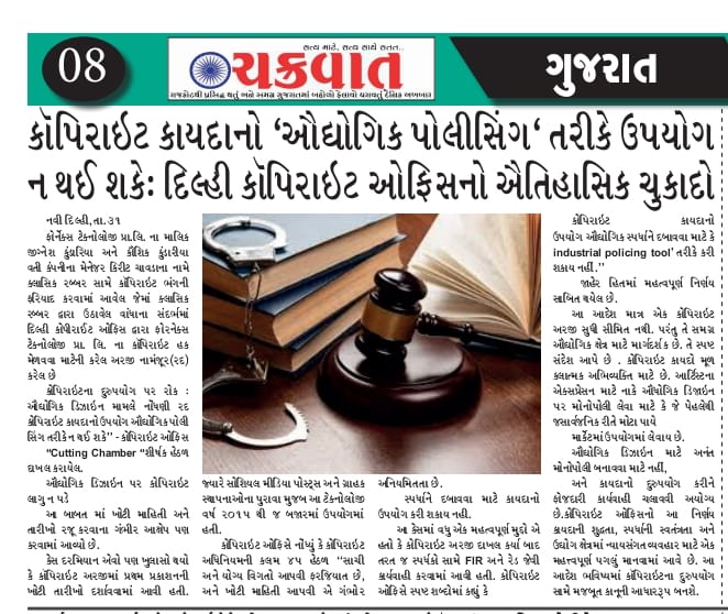કોપિરાઇટના દુરુપયોગ પર રોક : ઔદ્યોગિક ડિઝાઇન મામલે નોંધણી રદ *કોપિરાઇટ કાયદાનો ઉપયોગ ઔદ્યોગિક પોલી સિંગ તરીકે ન થઈ શકે” – કોપિરાઇટ ઓફિસ “Cutting Chamber “શીર્ષક હેઠળ દાખલ કરાયેલ. ઔદ્યોગિક ડિઝાઇન પર કોપિરાઇટ લાગુ ન પડે આ બાબત માં ખોટી માહિતી અને તારીખો રજૂ કરવાના ગંભીર આક્ષેપ પણ કરવામાં આવ્યો છે.