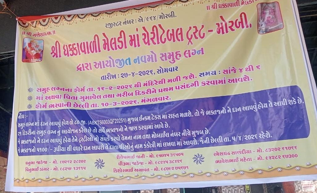 દર વર્ષની જેમ આ વર્ષે શ્રી ધક્કાવાળી મેલડી માં ચેરીટેબલ ટ્રસ્ટ મોરબી દ્વારા સમૂહ લગ્નનું આયોજન કરવામાં આવ્યું છે જેમાં શ્રી ધક્કાવાળી મેલડી માં ચેરીટેબલ ટ્રસ્ટ મોરબી દ્વારા નવમો સમૂહ લગ્ન તારીખ 27-04 -2026 ને સોમવારના રોજ યોજાશે.