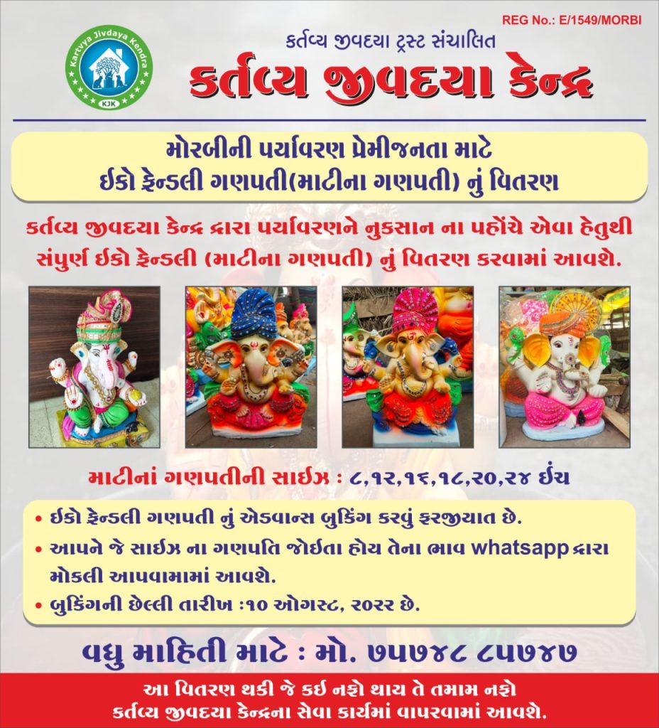 કર્તવ્ય જીવદયા કેન્દ્ર દ્વારા ઇકોફ્રેન્ડલી (માટી નાં ગણપતી ) નું વિતરણ કરવા માં આવશે.