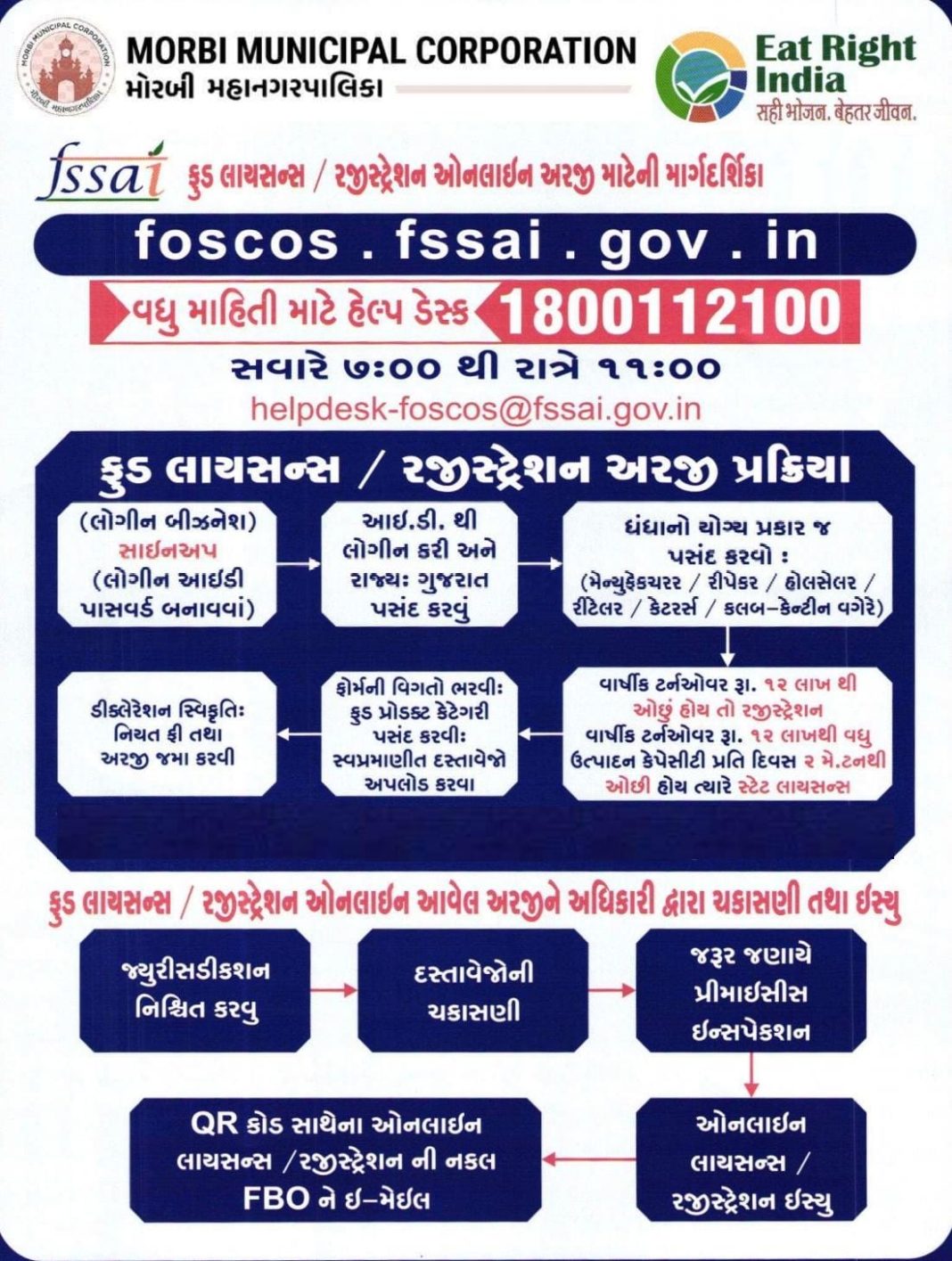 મોરબી મહાનગરપાલિકાની ફૂડ શાખા દ્વારા શહેરના ખાણી–પીણીના ધંધાર્થી ઓને જણાવવાનું કે નવા ફૂડ લાઇસસન્સ અને રજીસ્ટ્રેશન ઘેર બેઠા ઓનલાઈન કરી શકાય છે, ફૂડ લાયસન્સ મેળવવા માટેની માર્ગદર્શિકા જાહેર કરવામાં આવી છે, જેના માટે foscos.fssai.gov.in પર લૉગિન કરી મેળવી શકાય છે.