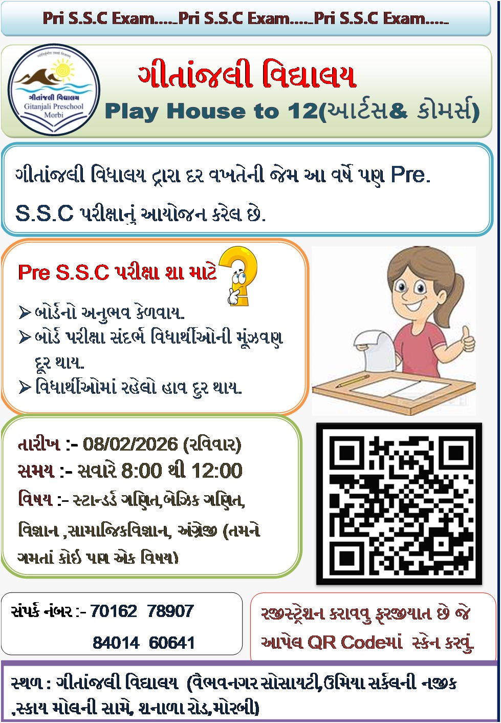 મોરબીની ગીતાંજલી વિદ્યાલય દ્વારા દર વર્ષની જેમ આ વર્ષે પણ PRI SSC પરીક્ષાનુ આયોજન કરેલ છે. જે વિદ્યાર્થી વર્ષ 2026 માં ssc બોર્ડની પરીક્ષા આપવાના છે એ વિદ્યાર્થીઓ માટે બોર્ડની પરીક્ષાનો અનુભવ કેળવાય એ માટે ગીતાંજલી વિદ્યાલય દ્વારા આ પરીક્ષાનુ આયોજન કરેલ છે ધોરણ ૧૦ માં કોઇપણ સ્કુલમાં અભ્યાસ કરતા વિદ્યાર્થી આ પરીક્ષા આપી શકશે.