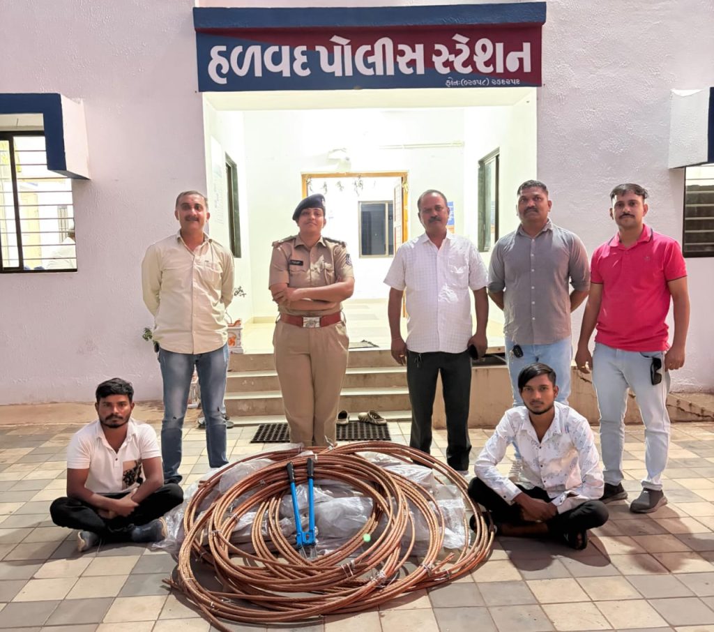 હળવદ તાલુકા પોલીસ સ્ટેશનનો સર્વેલન્સ સ્ટાફના અનડિટેકટ ગુનાઓ ડિટેકટ કરવા પ્રયત્નશીલ હોય તે દરમ્યા મળેલ બાતમીના આધારે સુખપર ગામની સીમમાંથી બે ઇસમો સુલતાન ઉર્ફે કાનો ધીરૂભાઇ પ્રભુભાઇ દેકાવાડીયા તથા રવી ધનશ્યામભાઇ પ્રભુભાઇ દેકાવાડીયા બન્ને રહે ગામ દેવપર સુખપર તા.હળવદવાળાને હળવદ પોલીસ સ્ટેશન વિસ્તારમાં કવાડીયા ગામની સીમમાં સોલાર પ્લાન્ટમાં ચોરીમાં ગયેલ ઇલેકટ્રીક કોપર કેબલ વાયરનુ કોપર ૪૬૦ કિલો ૭૦૦ ગ્રામ જેની કિ.રૂ ૨,૯૯,૪૫૫/- ના મુદામાલ સાથે પકડી આરોપીઓ વિરુધ્ધ કાયદેસરની કાર્યવાહી કરવામાં આવેલ છે.