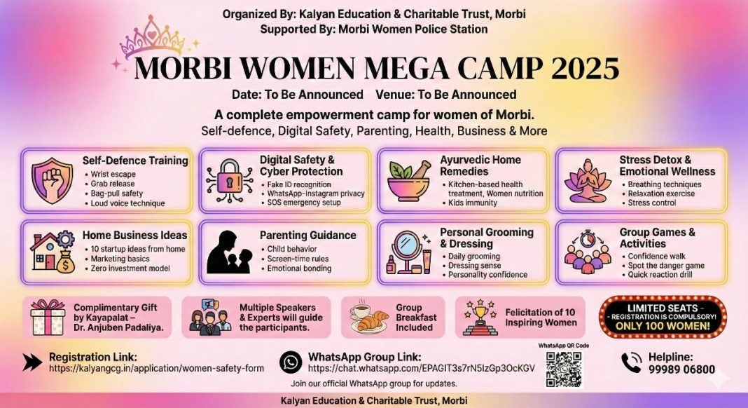 મોરબી ન્યૂઝ ડેસ્ક કેલ્યાણ એજ્યુકેશન એન્ડ ચેરિટેબલ ટ્રસ્ટ દ્વારા મોરબી શહેરમાં મહિલાઓ માટે એક ઐતિહાસિક અને અનોખું આયોજન થવા જઈ રહ્યું છે. મહિલાઓની સુરક્ષા, સ્વાસ્થ્ય, આત્મવિશ્વાસ, આર્થિક સ્વાવલંબન અને માનસિક શક્તિને કેન્દ્રમાં રાખીને “Women Empowerment Mega Camp – 2026” નું આયોજન કરવામાં આવ્યું છે. આ કાર્યક્રમ Kalyan Education & Charitable Trust – Morbi દ્વારા આયોજિત છે અને મોરબીમાં પહેલી વખત આટલી વ્યાપક સ્તરે મહિલાઓ માટે સંપૂર્ણ પ્રેક્ટિકલ આધારિત કેમ્પ યોજાઈ રહ્યો છે.