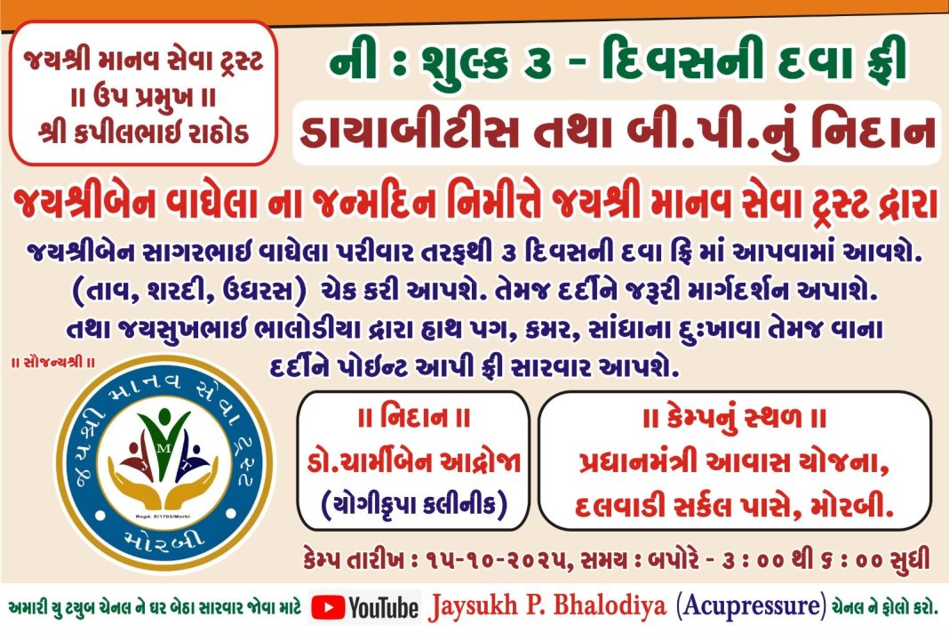 જયશ્રી માનવ સેવા ટ્રસ્ટના પ્રમુખ જયશ્રીબેન વાઘેલાના જન્મદિવસ નિમિત્તે તારીખ ૧૫ ઓક્ટોબર નાં રોજ બપોરે ૩:૦૦ થી ૬:૦૦ સુધી પ્રધાનમંત્રી આવાસ યોજના દલવાડી સર્કલ પાસે મોરબી ખાતે નિઃશુલ્ક મેડીકલ કેમ્પનું આયોજન કરવામાં આવ્યું છે.