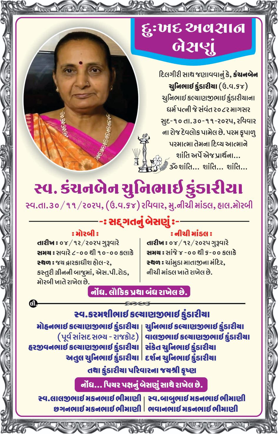 મૂળ મોરબી તાલુકાના નીચી માંડલ ગામના વતની અને હાલ મોરબી રહેતા ચુનીભાઈ કલ્યાણજીભાઇ કુંડારીયાના ધર્મ પત્ની કંચનબેન ચુનિભાઈ કુંડારીયા‌(ઉ.વ.૬૪) તારીખ ૩૦-૧૧-૨૦૨૫ ને રવિવારના રોજ દેવલોક પામેલ છે. પ્રભુ તેમના દિવ્ય આત્માને શાંતિ આપે એ જ પ્રાર્થના.
