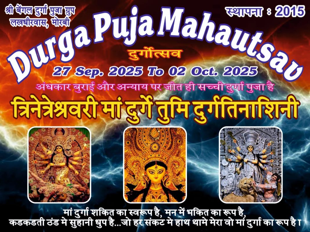 મોરબીના લખધીરવાસ ચોકમાં તા. ૨૭ સપ્ટેમ્બર થી તા. ૦૨ ઓક્ટોબર સુધી શ્રી બેંગલ દુર્ગાપુજા ગ્રુપ કમીટી દ્વારા દુર્ગાપુજા મહોત્સવનું ભવ્ય આયોજન કરવામાં આવ્યું છે.