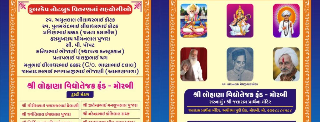 પ્રવર્તમાન વર્ષે લોહાણા સમાજ ના વિદ્યાર્થીઓને વિનામુલ્યે ફુલ સ્કેપ નોટબુક વિતરણ સ્વ. અમૃતલાલ લીલાધરભાઈ કોટક પરિવાર, સ્વ.પૂનમચંદભાઈ લીલાધર ભાઈ કોટક પરિવાર, પ્રવિણભાઈ કક્કડ (જનતા ક્લાસીસ) પરિવાર, હસમુખરાય ચીમનલાલ પુજારા પરિવાર, સી.પી. પોપટ પરિવાર, મનિષભાઈ ભોજાણી (સ્થાપત્ય કન્સટ્રક્શન) પરિવાર, પ્રતાપભાઈ વાલજીભાઈ ચગ પરિવાર, સ્વ.મનુભાઈ લીલાધરભાઈ ઠક્કર (ભાણાભાઈ દલાલ) પરિવાર, જમનાદાસભાઈ ભગવાનજીભાઈ ભોજાણી (આમરણ વાળા) પરિવાર ના સહયોગ થી અર્પણ કરવા મા આવશે. જેમા વિદ્યાર્થી ની માર્કશીટ ની ઝેરોક્ષ સાથે રાખવા ની રહેશે તેમ સંસ્થાએ યાદી મા જણાવ્યુ છે.
