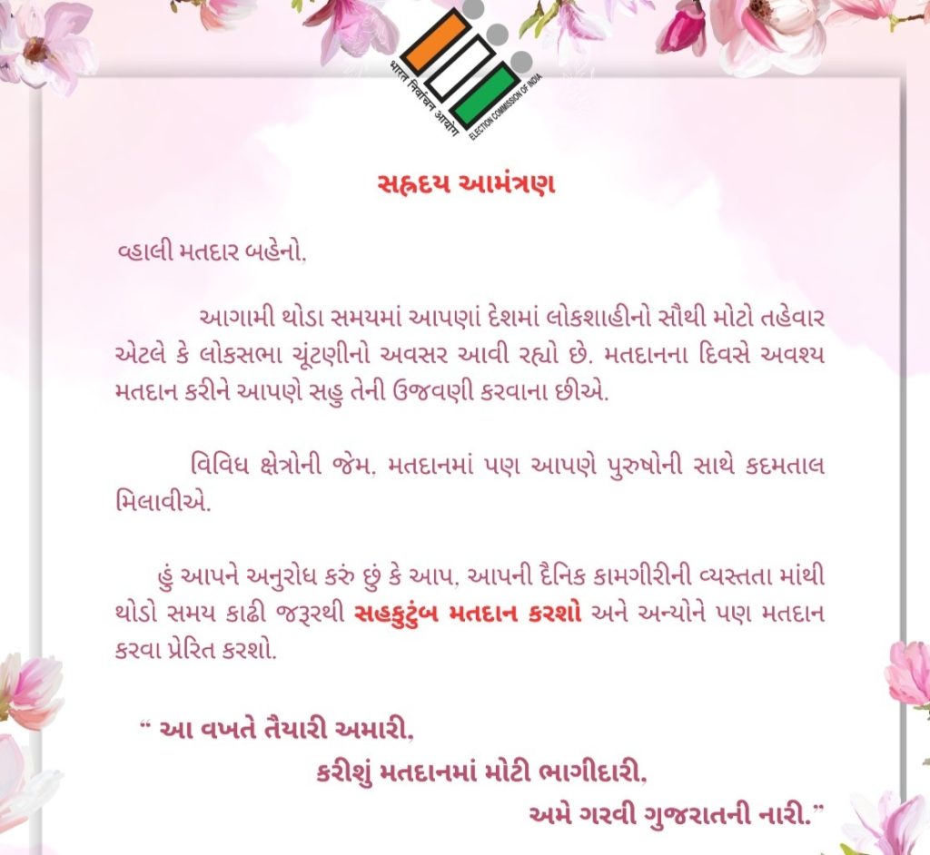 વિવિધતામાં એકતા ધરાવતા ભારતમાં અનેક સાંસ્કૃતિક વિવિધતાઓ વચ્ચે એક પરંપરા એવી છે જે લગભગ દેશભરમાં જોવા મળે છે. અને એ છે આંગણે આવેલા અવસરના આમંત્રણની. પારિવારિક અને માંગલિક પ્રસંગોના આમંત્રણની પ્રથાને એક સોપાન આગળ વધારતાં ગુજરાતના મુખ્ય નિર્વાચન અધિકારી શ્રીમતી પી. ભારતી દ્વારા લોકશાહીના મહાપર્વમાં મતદાન માટે મતદારોને સહપરિવાર આમંત્રણ પાઠવતી પત્રિકા મોકલવામાં આવશે.