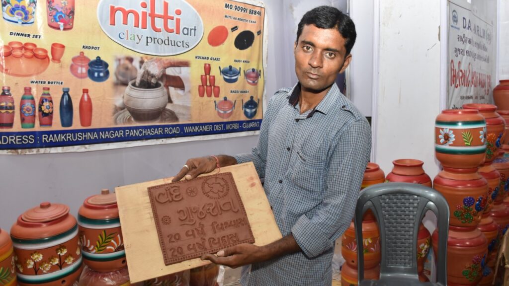 મોરબીમાં એલ.ઈ. કોલેજના ક્રિકેટ ગ્રાઉન્ડ ખાતે હાલ ગુજરાત વિકાસ પ્રદર્શન અને સખી મેળો ચાલી રહ્યો છે. જેમા વિવિધ સખી મંડળ અવનવી વસ્તુઓનું નિર્માણ કરી તેનું વેચાણ કરી રહ્યા છે. જેમાં વાંકાનેરના મીટ્ટી આર્ટ ક્લે પ્રોડક્ટ સાથે જોડાયેલા સખી મંડળ દ્વારા માટી માથી વિવિધ વાસણો બનાવી વેચાણ કરવામાં આવી રહ્યું છે. વંદે ગુજરાત વિકાસયાત્રા પ્રસ્થાન દરમિયાન તેમને વંદે ગુજરાત- ૨૦ વર્ષ વિશ્વાસ ૨૦ વર્ષ વિકાસ આબેહુબ કંડારી રાજ્યમંત્રી બ્રિજેશભાઈ મેરજાને અર્પણ કરી ગરવી ગુજરાત અને ગુજરાત સરકારને આ અનોખું સ્મૃતિચિન્હ અર્પણ કર્યું હતું.