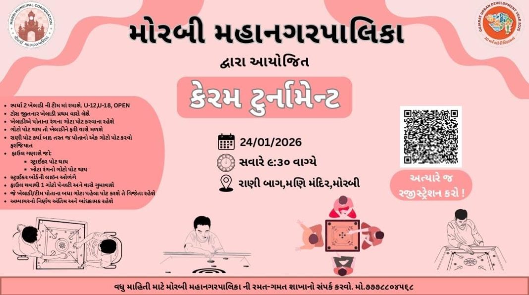 મોરબી મહાનગરપાલિકા દ્વારા શહેરના નાગરિકોમાં રમત ગમત પ્રત્યે જાગૃતિ વધે, બાળકો તથા યુવાનોમાં રમતિયાળ ભાવના વિકસે તેમજ સ્વસ્થ સ્પર્ધાત્મક માહોલ સર્જાય તે હેતુસર તા. ૨૪/૦૧/ ૨૦૨૬ (શનિવાર)ના રોજ “ઓલ મોરબી કેરમ ટુર્નામેન્ટ” નું આયોજન કરવામાં આવ્યું છે.