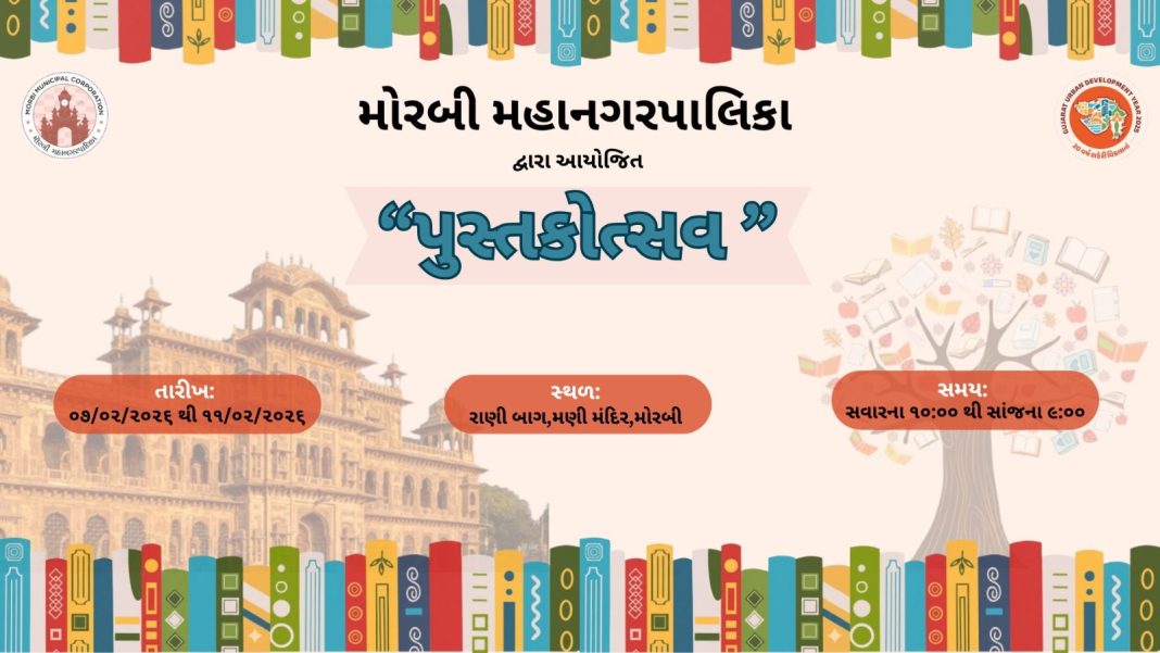 મોરબી શહેરના નાગરિકોમાં વાંચનની આદત વિકસે અને જ્ઞાનનો વિસ્તાર થાય તે હેતુથી મોરબી મહાનગરપાલિકા દ્વારા પુસ્તક મેળાનું ભવ્ય આયોજન કરવામાં આવી રહ્યું છે. આ પુસ્તક મેળો તારીખ ૦૭/૦૨/૨૦૨૬ થી ૧૧/૦૨/૨૦૨૬ દરમ્યાન, કુલ પાંચ દિવસ માટે આયોજિત કરવામાં આવ્યો છે. જેમાં કુલ ૧૯ સ્ટોલોનો સમાવેશ કરવામાં આવશે.