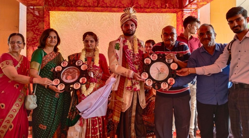 આ પ્રસંગે વોર્ડ નંબર 7 ના કાઉન્સિલર સીમા બેન અશોકભાઈ સોલંકી તેમજ મોરબી જિલ્લા ભાજપ ના પૂર્વ મહામંત્રી જે.પી જેસ્વાણી, રસ્મીનભાઇ દેસાઈ અન્ય આગેવાનો ઉપસ્થિત રહ્યાં હતાં અને નવયુગલને નમો ઘડિયાળ આપી આશિર્વાદ આપ્યા હતા.