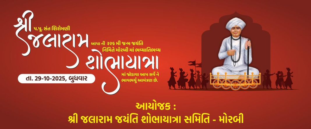 મોરબી : સંત શિરોમણી પૂજ્ય શ્રી જલારામ બાપા ની 226 મી જન્મજયંતિ નિમિતે આગામી તારીખ 29 ઓક્ટોબર ને બુધવાર ના રોજ મોરબી માં ભવ્યાતિભવ્ય શ્રી જલારામ બાપા ની શોભાયાત્રા તેમજ દિવ્ય મહાઆરતીનું આયોજન કરવામાં આવ્યું છે.