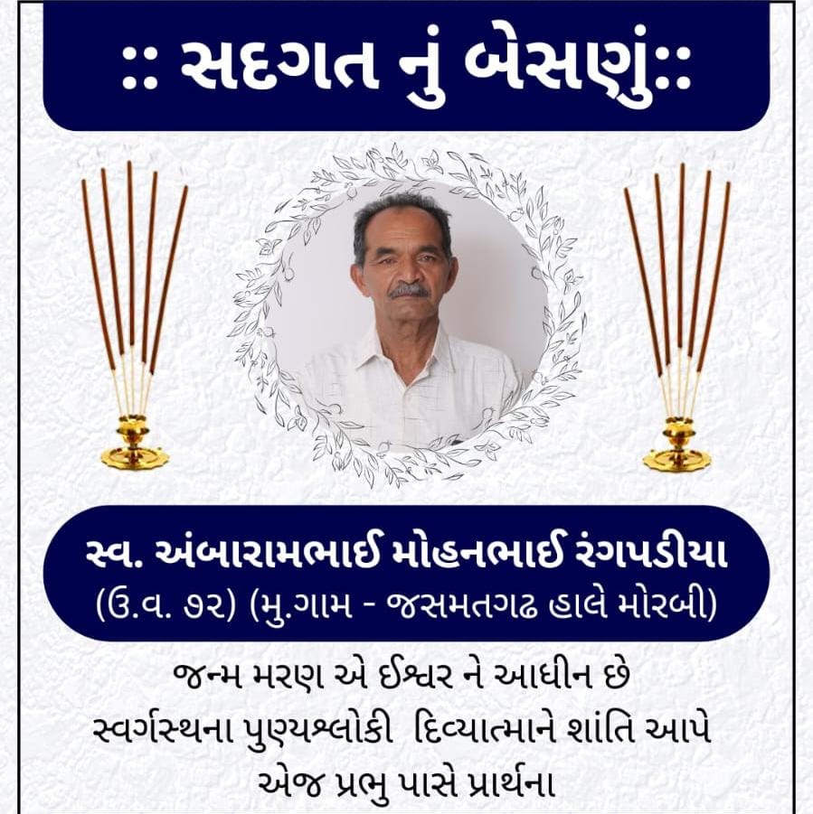 મૂળ જસમતગઢ ગામના વતની અને હાલ મોરબી નીવાસી અંબારામભાઈ મોહનભાઈ રંગપડીયા (ઉ.વ.૭૨) નું આજે તારીખ ૦૭-૧૦-૨૦૨૫ ને મંગળવારના રોજ દુઃખદ અવસાન પામેલ છે પ્રભુ તેમના દિવ્ય આત્માને શાંતિ આપે જ પ્રાર્થના.