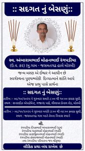 સદગતનુ બેસણું તારીખ ૦૯/૧૦/૨૦૨૫ ને ગુરુવારના રોજ સવારે ૦૮:૦૦ થી ૧૦:૦૦ કલાક સુધી સનરાઇઝ એપાર્ટમેન્ટ, ગજાનંદ પાર્ક, લીલાપર કેનાલ રોડ મોરબી ખાતે રાખેલ છે તેમજ તેજ દિવસે ગુરૂવારે બપોરના ૦૩:૦૦ થી ૦૪:૦૦ કલાક સુધી જસમતગઢ ગામ ખાતે તેમના નીવાસ સ્થાને બેસણુ રાખેલ છે.