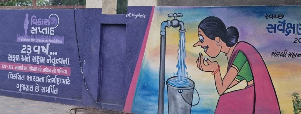 સમગ્ર રાજ્ય સહિત મોરબી જિલ્લામાં વિકાસ સપ્તાહની ભવ્ય ઉજવણી કરવામાં આવી રહી છે. જે અંતર્ગત મોરબી નગરપાલિકાના માર્ગદર્શન અનુસાર સમગ્ર મોરબી શહેરમાં આકર્ષક ભીંતચિત્રો તૈયાર કરવામાં આવ્યા છે આ ભીંતચિત્રોમાં નળ સે જળ પ્રધાનમંત્રી સુર્યઘર યોજના રાશન કાર્ડની સુવિધા વગેરે વિકાસલક્ષી પરિવર્તનની સુંદર ઝાંખી દર્શાવવામાં આવી છે.