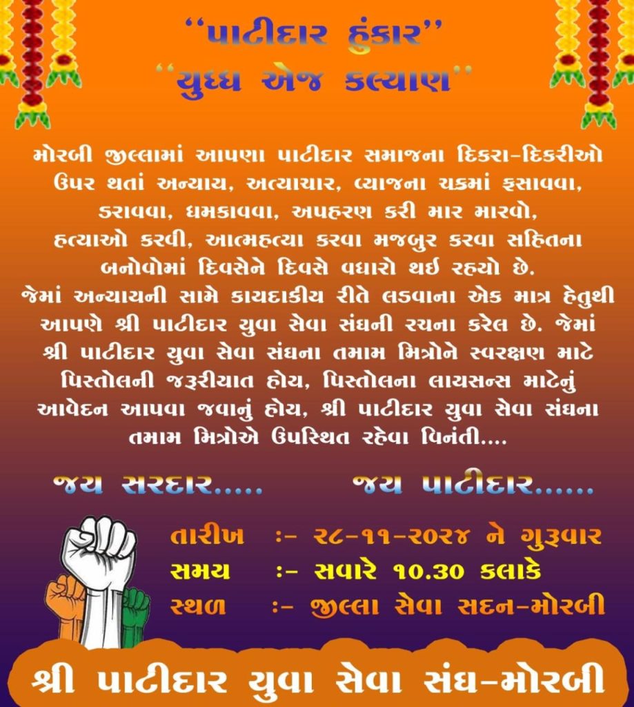 મોરબી જીલ્લામાં પાટીદાર સમાજના દીકરા – દિકરીઓ ઉપર થતા અન્યાયને લઈને આવતીકાલે મોરબી જીલ્લાના પાટીદાર સમાજના યુવકોના સ્વરક્ષણ માટે પાટીદાર યુવા સંઘ દ્વારા પિસ્તોલના લાયન્સ મેળવવા માટેનું કલેકટરને આવેદનપત્ર પાઠવશે.