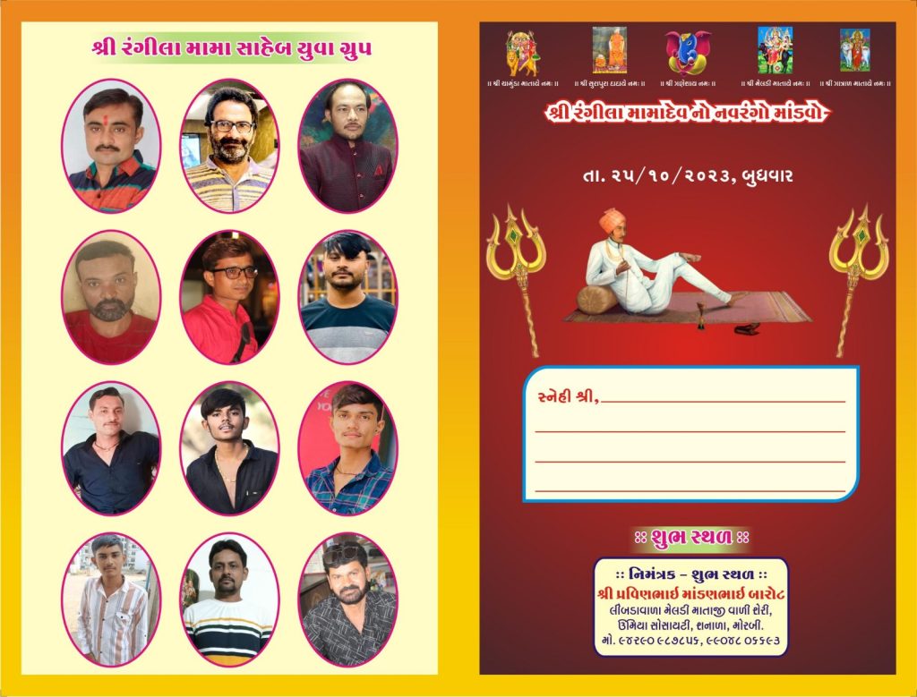મોરબી : શ્રી રંગીલા મામાદેવ મિત્ર મંડળ દ્વારા તા. ૨૫ ને બુધવારના રોજ શનાળા, લીમડાવાળા મેલડી મંદિર પાછળ ઉમિયાનગર સોસાયટી મોરબી ખાતે શ્રી રંગીલા મામાદેવનો નવરંગો માંડવો યોજાશે જેમાં તા.૨૫ ને બુધવારે સવારે મામાદેવનું મહાપૂજન, સાંજે ૬ કલાકે ઉમિયાનગર શકત શનાળા ખાતે મહાપ્રસાદ અને રાત્રે ૯ કલાકે ડાક ડમરૂ કાર્યક્રમ યોજાશે જે મહોત્સવમાં કલમના ભુવા ઉપેન્દ્રસિંહ પરમાર, રાવળદેવ ભવદિપભાઇ તથા સાથી ગ્રુપ અને શ્રી ચાંદલિયાવાળા મામાદેવના ભુવા યુવરાજસિહ રાઠોડ તેમજ પંચના ભૂવાઓ ઉપસ્થિત રહેશે. જે ધાર્મિક મહોત્સવનો લાભ લેવા શ્રી રંગીલા મામાસાહેબ યુવા ગ્રુપ શકત શનાળા તેમજ પ્રવીણભાઈ બારોટ દ્વારા જાહેર નિમંત્રણ પાઠવ્યું છે.