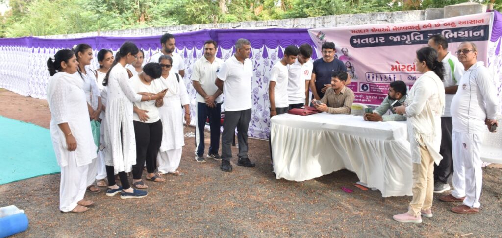 મોરબીના પોલીસ પરેડ ગ્રાઉન્ડ ખાતે વિશ્વ યોગ દિવસ નિમિત્તે જિલ્લા વહીવટી તંત્ર દ્વારા યોજાયેલ યોગ કાર્યક્રમમાં બાળકો, યુવાનો, વૃદ્ધો સૌ કોઈ યોગમય બન્યા હતા. ત્યારે આ કાર્યક્રમમાં જિલ્લા વહીવટી તંત્ર દ્વારા મતદાન જાગૃતિ અભિયાન માટે એક અલાયદો સ્ટોલ રાખવામાં આવ્યો હતો. તારીખ ૦૧/૦૧/૨૦૨૨ ના જેમને ૧૮ વર્ષ પૂરા થઈ ગયા હોય તેમને નોંધણી કરાવવા માર્ગદર્શન પુરુ પાડવામાં આવ્યું હતું. ચૂંટણી કાર્ડ માં સુધારા વધારા કરવા માટે ઓનલાઇન સર્વિસનો મહત્તમ ઉપયોગ કરવા સૌને માહિતગાર કરાયા હતા.
