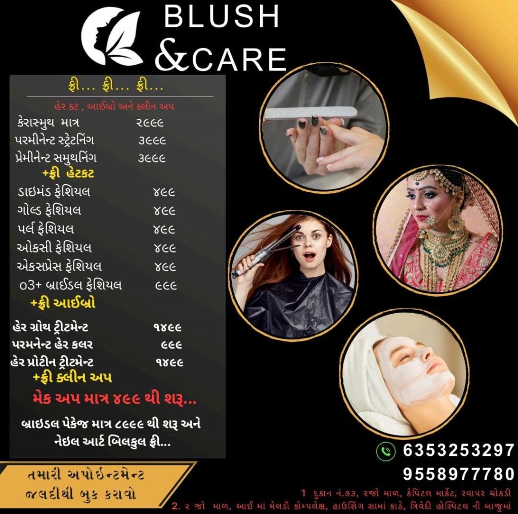 મોરબીની રવાપર ચોકડી કેપિટલ માર્કેટ બીજો માળ દુકાન નંબર -૭૩ તથા મોરબીના સામા કાંઠે હાઉસીંગ ત્રિવેદી હોસ્પિટલની બાજુમાં આઇમા મેલડી કોમ્પલેક્ષમા બીજા માળે આવેલુ બ્લુસ & કેર બ્યુટી સલૂન ખૂબ જાણીતું છે. અહીં સમયાંતરે ગ્રાહકો માટે ખાસ આકર્ષક ઓફર્સ રાખવામાં આવતી હોય છે. જે અંતર્ગત હાલ અહીં એક બ્યુટી પેકેજ લોન્ચ કરવામાં આવ્યું છે. જેમાં મેકઅપ માત્ર ૪૯૯ થી શરૂ તથા બ્રાઇડલ પેકેજ માત્ર ૮૯૯૯થી શરૂ અને નેઇલ આર્ટ બિલકુલ ફ્રી તેમજ હેરકેટ, આઈબ્રો, ક્લીનઅપ પણ ફ્રી રાખવામાં આવેલ છે તેમજ કેરાસ્મુથ માત્ર રૂ.૨૯૯૯, પરમીનેન્ટ સ્ટ્રેટનિંગ રૂ.૩૯૯૯ , પ્રેમીનેન્ટ સમુથનિંગનું રૂ.૩૯૯૯ , તેમજ ડાઇમંડ ફેશિયલ, ગોલ્ડ ફેશિયલ, પર્લ ફેશિયલ, ઓક્સી ફેશિયલ, ૦૩+ બ્રાઇડલ ફેશિયલ તમાંમની માત્ર રૂ. ૪૯૯ માં ટ્રીટમેન્ટ મળશે અને હેર ગ્રોથ ટ્રીટમેન્ટ રૂ.૧૪૯૯, પરમનેન્ટ હેર કલર રૂ.૯૯૯, હેર પ્રોટીન ટ્રીટમેન્ટ રૂ.૧૪૯૯ માં મળશે. મોરબીવાસીઓને ખૂબ જ વ્યાજબી ભાવે શ્રેષ્ઠ બ્યુટી ટ્રીટમેન્ટ મળી રહી છે તો તેનો લાભ લેવાનું ચૂકવા જેવું નથી. તેમજ વધુ વિગત માટે મો.નં. 6353253297, 95589 77780 ઉપર સંપર્ક કરવો.