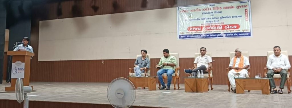 અમદાવાદના ડો.બાબા સાહેબ આંબેડકર ઓપન યુનિવર્સિટી ખાતે અખિલ ભારતીય રાષ્ટ્રીય શૈક્ષિક મહાસંઘની રાજ્ય કારોબારીની બેઠકમાં શાળા, બાળક અને શિક્ષકોના હિત માટેના આ મુજબના પ્રશ્નો ઉકેલ માટે સરકાર સમક્ષ રજુઆત કરવા રજૂ કરાયા જેમ કે