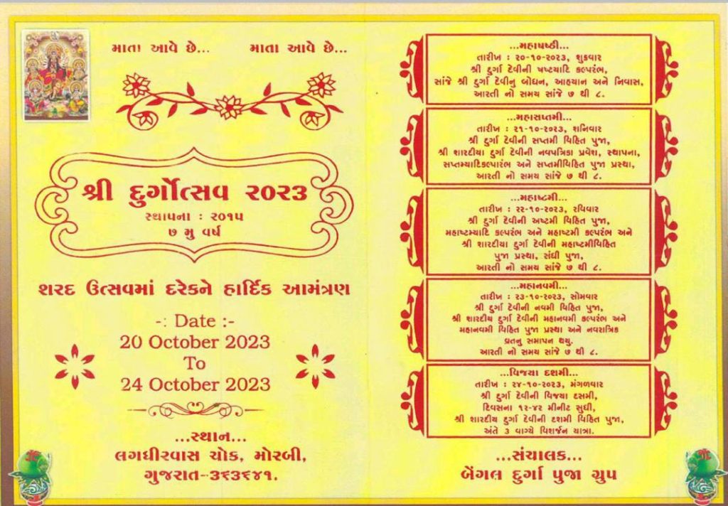 મોરબીના લખધીરવાસ ચોકમાં 20 ઓક્ટો. થી બેંગલ દુર્ગાપૂજા ગ્રુપ કમીટી દ્વારા દુર્ગાપુજા મહોત્સવનું ભવ્ય આયોજન