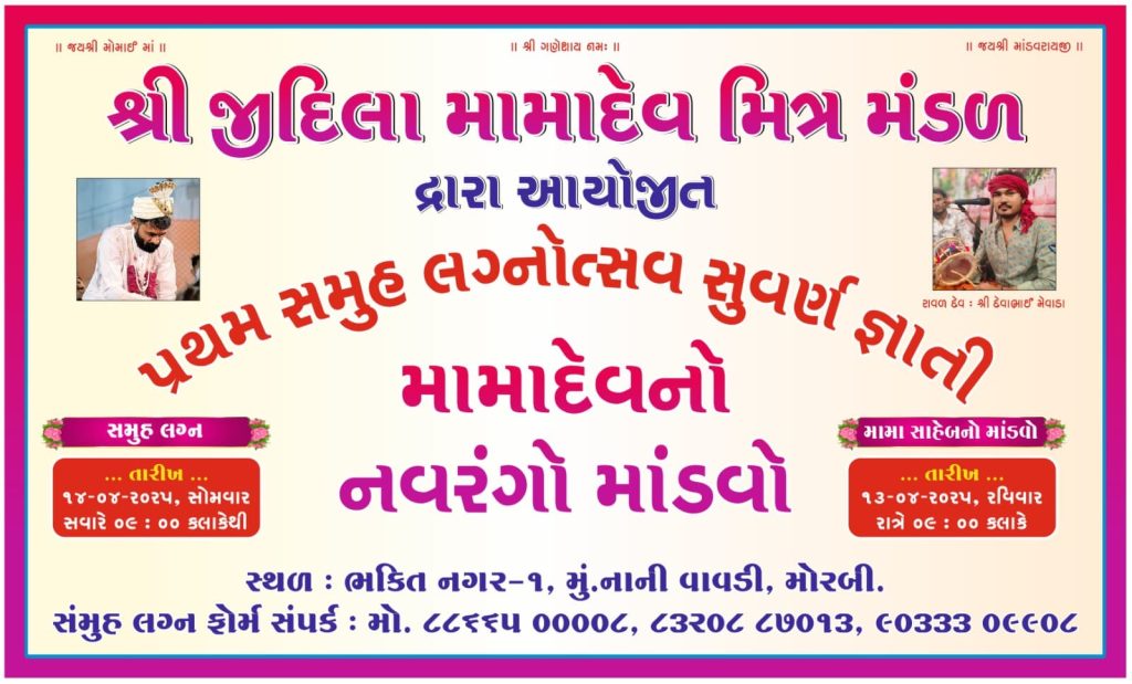 આ નવરંગા માંડવામાં કલમના ભુવા ઉપેન્દ્રસિંહ પરમાર અને વિવિધ પંચના ભુવા પણ હાજરી આપશે.આ નવરંગા માંડવામાં પધારવા માટે સૌને જાહેર આમંત્રણ પાઠવ્યું છે. તો તા: 14 એપ્રિલને સોમવારે સવારે સમુહલગ્નનું આયોજન કરવામાં આવ્યું છે.જેમા માં -બાપ વગર દિકરીઓને પ્રથમ પાધાન્ય આપવામાં આવશે.જે વર કન્યા આ સમુહલગ્નમાં જોડાવા માંગતા હોય તેઓએ તાત્કાલિક તેમના નામ નોંધાવી લેવા નામ નોંધાવા તેમજ વધુ જાણકારી માટે કાનભા મો : 88665 00008, જનકભાઈ રાજા : મો.8320 887013, નિકુંજ ગોસાઈ મો.: 90333 09908 સંપર્ક કરવા જીદિલા મામાદેવ મિત્ર મંડળની યાદીમાં જણાવાયું છે.