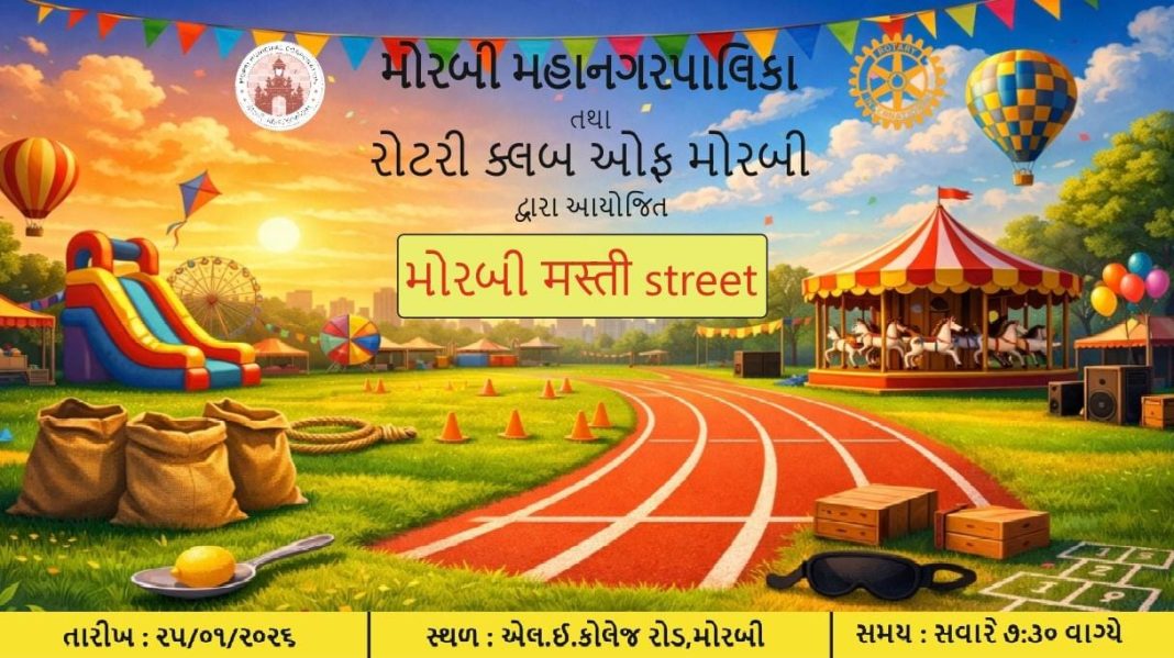 મોરબી મહાનગરપાલિકા દ્વારા પ્રજાસત્તાક પર્વની પૂર્વે તા. 25-01-26 ના રોજ મોરબી મસ્તી streetનું આયોજન કરવામાં આવનાર છે, મોરબી મનપા દ્વારા તાજેતર માં વિસરાતી જતી રમતો થી બાળકો નજીક આવે તેવો પ્રયત્ન કરવામાં આવ્યો હતો, જેમાં મળેલી સફળતાના ભાગ રૂપે આગામી પ્રજા સત્તાક પર્વની પૂર્વે આ પ્રકારની જૂની રમતો બાળકો રમે તેવું મોરબીની એલ. ઇ. કોલેજ રોડ પર વિનામૂલ્યે મોરબી મસ્તી street આયોજન કરવામાં આવનાર છે.