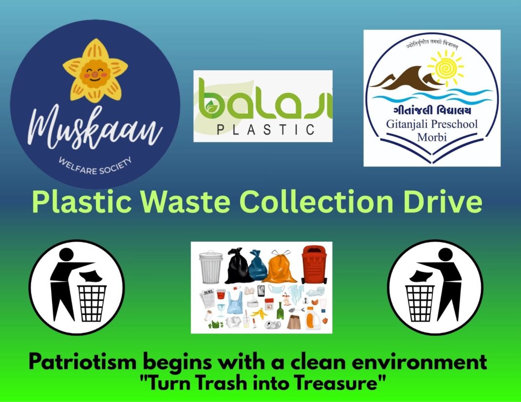 મોરબી સ્થિત મુસ્કાન વેલફેર સોસાયટી દ્વારા દેશના પ્રજાસત્તાક દિવસની ભાવનાને અનુરૂપ એક અર્થપૂર્ણ પહેલ તરીકે 26 જાન્યુઆરી – પ્રજાસત્તાક દિવસથી “પ્લાસ્ટિક કચરો સંગ્રહ અભિયાન”ની શરૂઆત કરવામાં આવી છે. આ અભિયાન ગીતાાંજલી વિદ્યાલયના સહયોગથી તથા બાલાજી પ્લાસ્ટિકના સહકારથી અમલમાં મૂકવામાં આવ્યું છે.