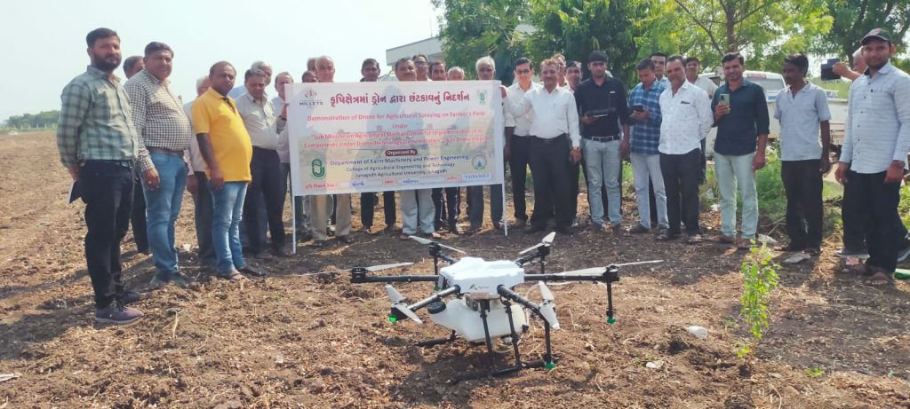 ખેડૂતોને ડ્રોન ટેકનોલોજી વિશે માર્ગદર્શન આપવા કૃષિ વિજ્ઞાન કેન્દ્ર, મોરબી અને કૃષિ ઇજનેરી કોલેજ જૂનાગઢના સંયુક્ત ઉપક્રમે મોરબી જિલ્લાના નસિતપર ગામે ડ્રોન ટેકનોલોજી દ્વારા કપાસ અને મરચીના પાકમાં જીવાત નિયંત્રણ માટે જંતુનાશક દવા બિવેરિયાના છંટકાવનું પ્રત્યક્ષ નિદર્શન ગોઠવવામાં આવ્યું હતું. જેમાં આજુ-બાજુના ગામના મળીને ૫૦ જેટલા ખેડૂત મિત્રોએ ભાગ લીધો હતો. આ નિદર્શનમાં ડ્રોન ટેકનોલોજી વિશે માર્ગદર્શન આપી મિત્રો પાસેથી અભિપ્રાય લેવામાં આવ્યો હતો જેથી આ ડ્રોન ટેકનોલોજીમાં ખેડૂતની જરૂરિયાત મુજબના સુધારા વધારા કરી વ્યહવારું બનાવી શકાય. આ નિદર્શનમં ખેડૂતોના પ્રશ્નોનું નિરાકરણ પણ કરવામાં આવ્યું હતું