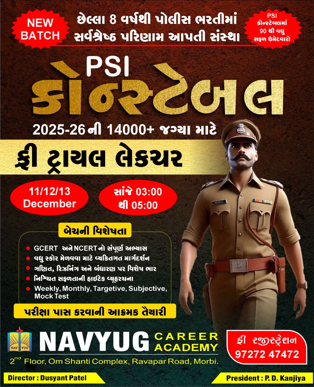 રાજ્યમાં PSI તથા કોન્સ્ટેબલ ની બમ્પર ભરતી જાહેર થતા મોરબીની પ્રતિષ્ઠિત નવયુગ કરિયર અકાડેમી દ્વારા સ્પર્ધાત્મક પરીક્ષાની તૈયારી કરતા વિદ્યાર્થીઓ માટે ફ્રી ટ્રાયલ લેક્ચરનું આયોજન કરવામાં આવ્યું છે.