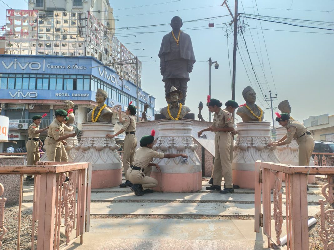 કેડેટ્સની શિસ્તબદ્ધ પરેડ અને નવા બસ સ્ટેન્ડ ખાતે મહાપુરુષોની પ્રતિમાની સફાઈ