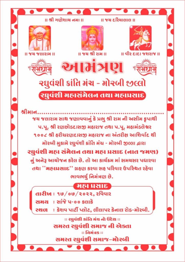 મોરબીમાં આગામી ૧૭ જુલાઈના રોજ રઘુવંશી સમાજનું મહાસંમેલન મળશે.