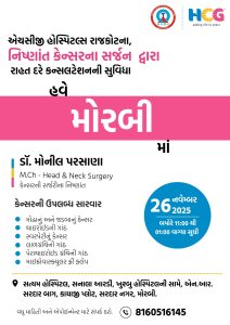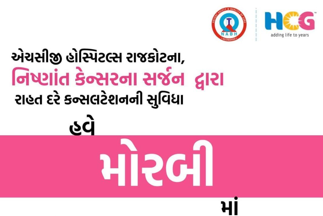 આગામી તારીખ 26 નવેમ્બરે ને બુધવારના રોજ રાજકોટની નામાંકિત એચસીજી હોસ્પિટલના નિષ્ણાંત ડૉ. મોનીલ પરસાણા ( Mch-Head& Neck surgery) કેન્સર સર્જન દ્વારા મોરબીની સત્યમ હોસ્પિટલ, સનાલા આરડી, ખુશ્બુ હોસ્પિટલની સામે, એન.આર. સરદાર બાગ, કાયાજી પ્લોટ, સરદાર નગર, મોરબી ખાતે તારીખ 26 નવેમ્બરને બુધવારના રોજ સવારે-11:00 થી 01:00 વાગ્યા સુધી રાહત દરે કન્સલટેશન ઓપીડીનું આયોજન કરવામાં આવ્યું છે.