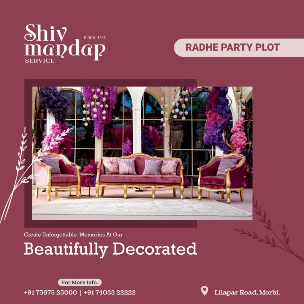 તમારા પ્રસંગને ચાર ચાંદ લગાવશે રાધે પાર્ટી પ્લોટ તેની ફેસીલીટી સાથે મોરબીમાં ક્યાંય ના હોય તેવું ડેકોરેશન તો ખરું જ પ્રસંગ તમારો સજાવટ અને વ્યવસ્થા તો શિવ મંડપની જ