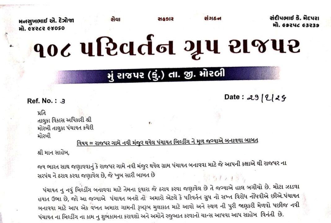 મોરબી તાલુકાના રાજપર કુંતાસી ગામે નવી મંજૂર થયેલી ગ્રામ પંચાયતનું બિલ્ડીંગ મૂળ જગ્યાએ બનાવવા બાબતે 108 પરિવર્તન ગ્રુપ રાજપર દ્વારા મોરબી તાલુકા વિકાસ અધિકારીને રજૂઆત કરી મંજૂર થયેલ પંચાયતનું બિલ્ડીંગ મૂળ જગ્યાએ બનાવવા માંગ કરી છે.