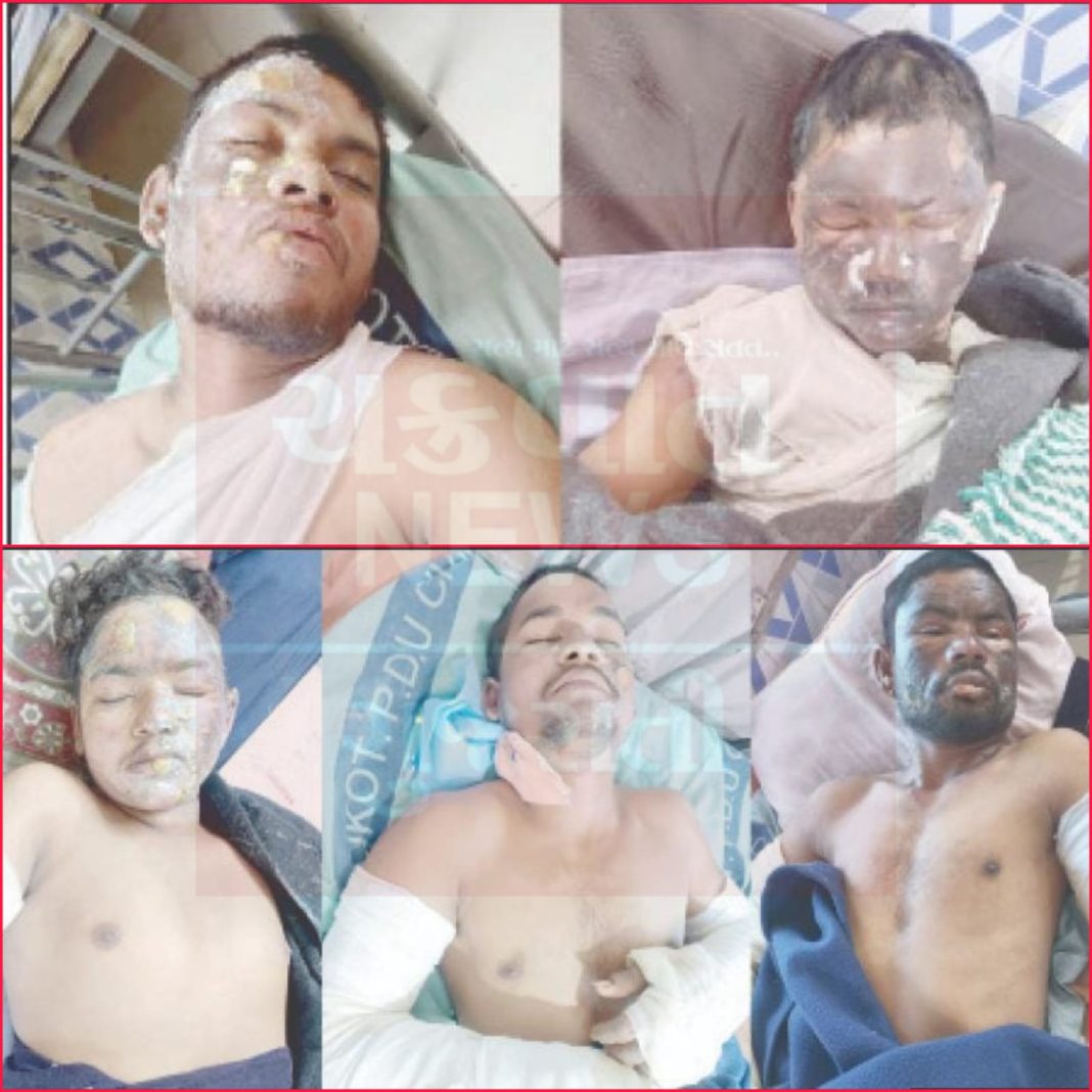 જેમાં ઇતવાડી બંગાલી (ઉં.વ. ૨૨), સુરજ બકસી (ઉ.વ. ૨૫), અમન બકસી (ઉ.વ. ૨૩), વિનય બકસી (ઉં.વ. ૧૭) શીવા ભરત (ઉં.વ. ૨૩ ) સહિત પાંચ શ્રમીકો દાઝી ગયા હતા જેમને તાત્કાલિક સારવાર માટે રાજકોટ સિવીલ હોસ્પીટલે આવેલા બર્ન્સ વિભાગમા ખસેડાયા હતા, ત્યા જાણવા મળ્યુ હતુ કે પાંચેય શ્રમીકો મુળ રાજસ્થાનની વતની છે અને છેલ્લા એકાદ વર્ષથી આ કંપનીમા આવેલી ઓરડીમાં રહી ટાઇલ્સ બનાવવાનુ કામ કરે છે. શ્રમીકોએ જણાવ્યુ હતુ કે તેઓ બધા સુતા હતા ત્યારે ઓરડીમા ગેસ લીકેજ થયો હતો જેને કારણે ગેસ સમગ્ર ઓરડીમા ફેલાઇ ગયો હતો અને જાગીને એક શ્રમીકે દીવાસળી પેટાવતા ભડકો થયો હતો અને આગમા પાંચેષ શ્રમીકો મોઢા પર અને શરીરે ગંભીર રીતે દાઝયા હતા . હાલ તમામ શ્રમીકો રાજકોટ સિવિલ હોસ્પિટલમાં સારવાર હેઠળ હોવાનું જાણવા મળી રહ્યું છે.
