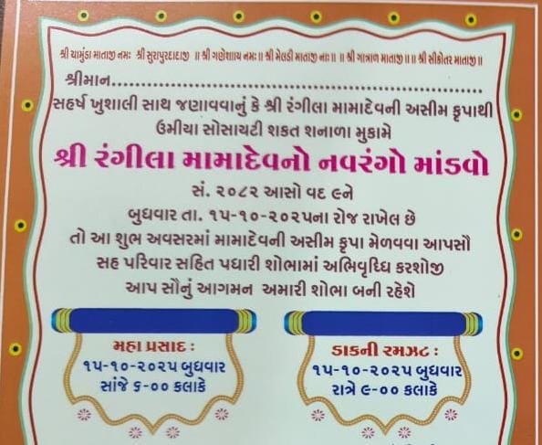 મોરબી : શ્રી રંગીલા મામાદેવ મિત્ર મંડળ દ્વારા તા. ૧૫ ને બુધવારના રોજ શનાળા, લીમડાવાળા મેલડી મંદિર પાછળ ઉમિયાનગર સોસાયટી મોરબી ખાતે શ્રી રંગીલા મામાદેવનો નવરંગો માંડવો યોજાશે જેમાં તા.૧૫ ને બુધવારે સવારે મામાદેવનું મહાપૂજન, સાંજે ૬ કલાકે ઉમિયાનગર શકત શનાળા ખાતે મહાપ્રસાદ અને રાત્રે ૯ કલાકે ડાક ડમરૂ કાર્યક્રમ યોજાશે.