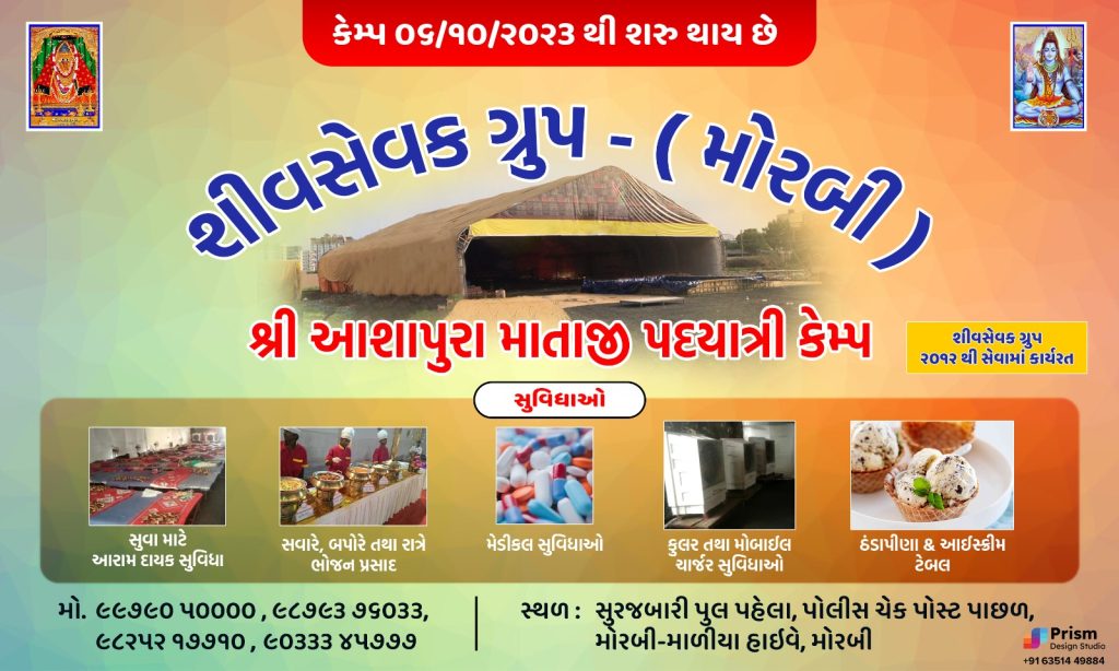 મોરબીમાં શીવ સેવક ગ્રુપ (રવાપર રોડ) દ્વારા માતાના મઢ જતા પદયાત્રીઓ માટે સુરજબારી પુલ પાસે તમામ સુવિધાથી સજ્જ તારીખ 6/10/23 થી 4 દિવસ માટે કેમ્પનું આયોજન કરવામાં આવશે.