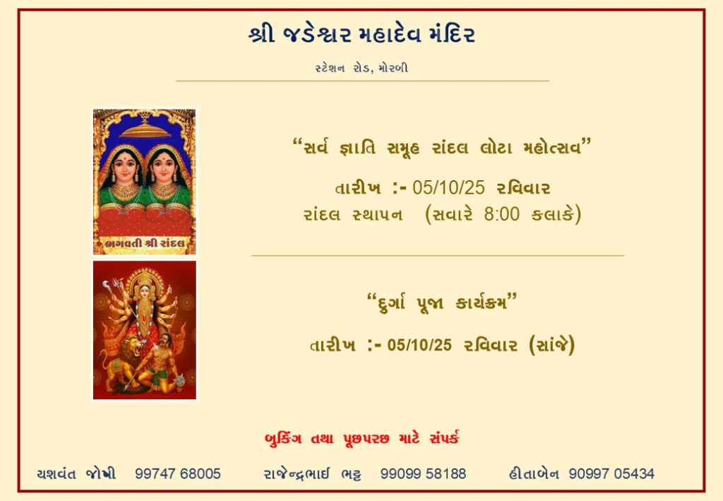 શ્રી જડેશ્વર મહાદેવ સેવા મંડળ ટ્રસ્ટ મોરબી દ્વારા “સર્વ જ્ઞાતિ સમૂહ રાંદલ લોટા મહોત્સવ તથા મહાદુર્ગાપૂજા કાર્યક્રમ”નુ આયોજન