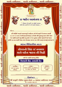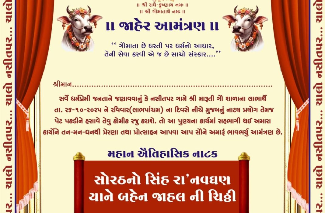 તો આ નાટક અને કોમિક નિહાળવા તથા ગૌ સેવા ના આ ભગીરથકાર્યમાં સહભાગી થવા જાહેર જનતાને શ્રી મારૂતી ગૌ શાળા ટ્રસ્ટ તથા સમસ્ત નસીતપર ગામ વતી ભાવભર્યું આમંત્રણ પાઠવવામાં આવેલ છે.
