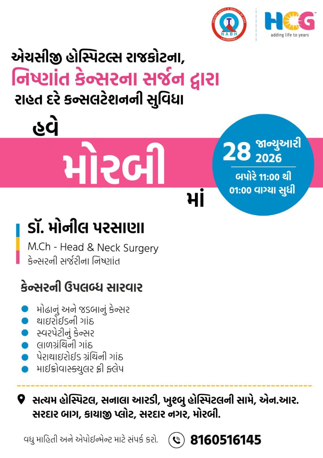 રાજકોટની નામાંકિત એચસીજી હોસ્પિટલના કેન્સરની સર્જરીના રોગોના નિષ્ણાંત M.ch (Head &Neck Surgery) ડૉ. મોનીલ પરસાણા દ્વારા આગામી તારીખ 28 જાન્યુઆરી બુધવારના રોજ બપોરે 11:00 થી01:00 વાગ્યા સુધી સ્થળ સત્યમ હોસ્પિટલ સનાલા આરડી, ખુશ્બુ હોસ્પિટલની સામે એન.આર સરદારબાગ કાયાજી પ્લોટ સરદાર નગર મોરબી ખાતે રાહતદરે ઓપીડીનું આયોજન કરવામાં આવ્યું હોય.